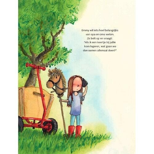 Emmy belt opa en oma en vraagt wat ze samen gaan doen als zij daar een keertje komt logeren. Dat weten ze wel! Zo willen ze met Emmy achter de kippen aan rennen, in de botsauto’s rijden en een potje Twister spelen. Maar dat is niet alles, want als je bij opa en oma logeert, word je natuurlijk nog véél meer verwend.