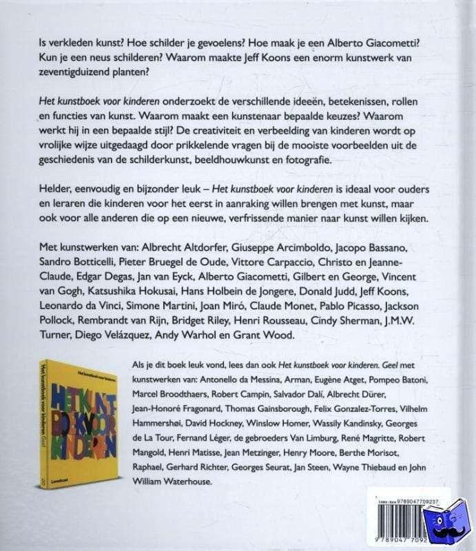 Waarom werkt hij in een bepaalde stijl? De creativiteit en verbeelding van kinderen wordt op vrolijke wijze uitgedaagd door prikkelende vragen bij de mooiste voorbeelden uit de geschiedenis van de schilderkunst, beeldhouwkunst en fotografie. Helder, eenvoudig en bijzonder leuk - Het kunstboek voor kinderen is ideaal voor ouders en leraren die kinderen voor het eerst in aanraking willen brengen met kunst, maar ook voor alle anderen die op een nieuwe, verfrissende manier naar kunst willen kijken. Met kunstwerken van: Albrecht Altdorfer, Giuseppe Arcimboldo, Jacopo Bassano, Sandro Botticelli, Pieter Bruegel de Oude, Vittore Carpaccio, Christo en Jeanne-Claude, Edgar Degas, Jan van Eyck, Alberto Giacometti, Gilbert en George,Vincent van Gogh, Katsushika Hokusai, Hans Holbein de Jongere, Donald Judd, Jeff Koons, Leonardo da Vinci, Simone Martini, Joan Miró, Claude Monet, Pablo Picasso, Jackson Pollock, Rembrandt van Rijn, Bridget Riley, Henri Rousseau, Cindy Sherman, J.M.W. Turner, Diego Velázquez, Andy Warhol en Grant Wood.
