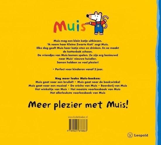 De kleine zwarte kat klimt bij Muis op schoot. Als Muis haar aait, gaat ze spinnen.