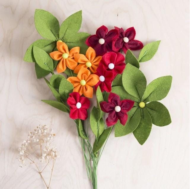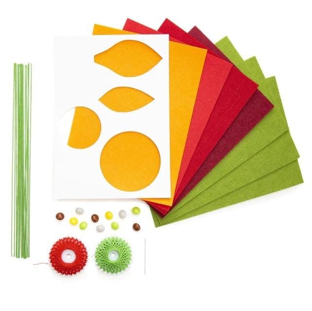 - Doe-het-zelf. Bevat 7 vilten vellen, 15 draadstelen, 11 knopen, naald en draad en een papieren sjabloon.