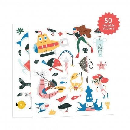Een stickerplaat van een meter lang! Daar kun je heel wat uren plezier aan beleven. Verzin onderwater verhalen over zeesterren, vissen en krabben. De stickers zijn herplakbaar. De volgende keer kun je dus weer een nieuw verhaal verzinnen! Met wie duik jij deze stickerplaat in?