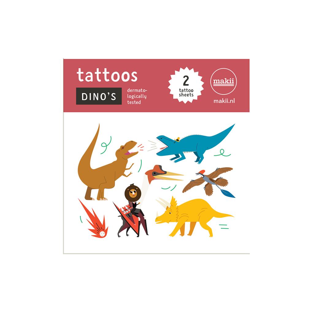 Met de Makii Tattoos Dinos plak je in een handomdraai 14 gekke dino’s op je huid. Van brullende T-rex tot vrolijke vliegende dino’s – op elk vel zit wel een favoriet. Knip, plak, nat doekje erop… klaar! Zijn ze na een paar dagen niet meer cool? Geen probleem – met een beetje babyolie wrijf je ze zo weer weg. De tattoos zijn dermatologisch getest, veilig in gebruik en verantwoord geproduceerd.