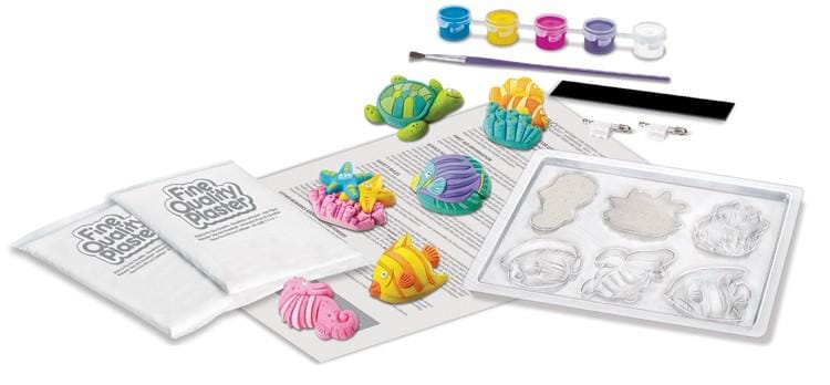 - Inhoud: plastic vorm met 6 ontwerpen, 1 zakje gips poeder, 1 magneetstrip, 1 penseel, 5 minipotjes verf en gedetailleerde gebruiksaanwijzing.