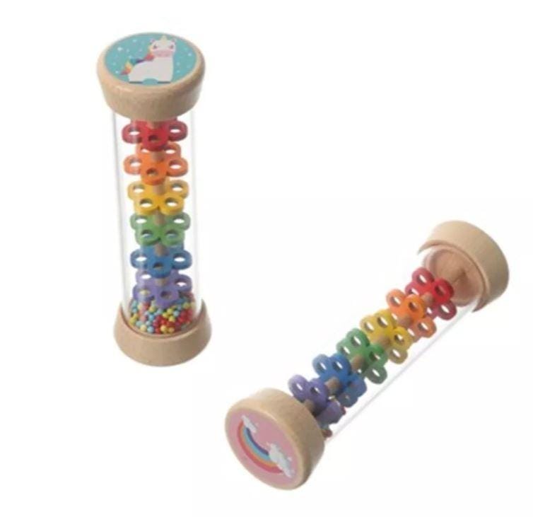 Maak met deze regenmaker echte regenbuien - gietende, plenzende of miezerende regen - zonder nat te worden! Een mooi houten speeltje in prachtige regenboogkleuren. Met op de kopse kant aan de ene kant een eenhoorn en aan de andere kant een regenboog. De regenmaker is 19 x 5,5 cm en ziet er ook mooi uit om zo neer te zetten.