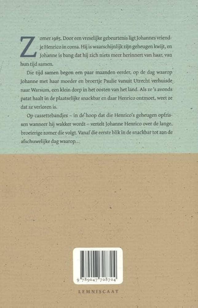 Zomer 1985. Door een vreselijke gebeurtenis ligt Johannes vriendje Henrico in coma. Hij is waarschijnlijk zijn geheugen kwijt, en Johanne is bang dat hij zich niets meer herinnert van haar, en van hun tijd samen. Die tijd samen begon een paar maanden eerder, op de dag waarop Johanne met haar moeder en broertje Paulie vanuit Utrecht verhuisde naar Warsum, een klein dorp in het oosten van het land. Als ze 's avonds patat haalt in de plaatselijke snackbar en daar Henrico ontmoet, weet ze dat ze verloren is. Op cassettebandjes - in de hoop dat die Henrico's geheugen opfrissen wanneer hij wakker wordt - vertelt Johanne Henrico over de lange, broeierige zomer die volgt. Vanaf die eerste blik in de snackbar tot aan die afschuwelijke dag waarop...