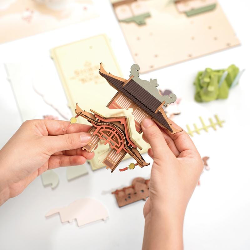 Dompel jezelf onder in de schoonheid van de Japanse natuur met de Falling Sakura. Dit unieke 3D houten puzzelpakket van Robotime laat je een miniatuurlandschap bouwen met een paviljoen, een vijver en natuurlijk de beroemde vallende kersenbloesems. Alle houten onderdelen zijn zorgvuldig lasergesneden en gemakkelijk in elkaar te zetten. Schakel de warme lichten aan voor een extra magische sfeer. Perfect als decoratie voor je boekenplank of bureau, of als uniek cadeau voor jezelf of iemand anders.