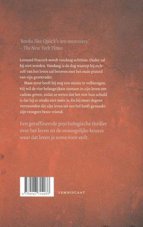 Leonard Peacock wordt vandaag achttien. Ouder zal hij niet worden. Vandaag is de dag waarop hij zichzelf van het leven zal beroven met het oude pistool van zijn grootvader. Maar eerst heeft hij nog een missie te volbrengen. Hij wil de vier belangrijkste mensen in zijn leven een cadeau geven, zodat ze weten dat het niet hun schuld is dat hij er straks niet meer is. En hij moet degene vermoorden die zijn leven tot een hel heeft gemaakt: zijn vroegere beste vriend. Een geraffineerde psychologische thriller over het leven en de onmogelijke keuzes waar dat leven je soms voor stelt.