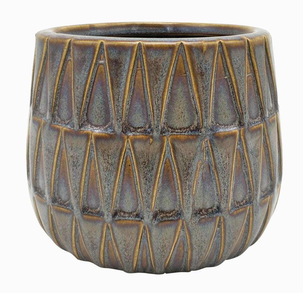 Bloempot Nomad – Small is een stoere, keramieken bloempot met een subtiel reliëfpatroon en een warme bruine tint. De structuur en glazuurafwerking geven de pot een robuuste uitstraling, terwijl het compacte formaat hem perfect maakt voor kleinere kamerplanten of stekjes. Dankzij het tijdloze ontwerp past deze bloempot moeiteloos in verschillende interieurstijlen, van modern tot bohemian. Mooi op zichzelf, maar ook goed te combineren met andere maten uit de Nomad-serie. De pot is gemaakt van keramiek en bedoeld voor gebruik binnenshuis.