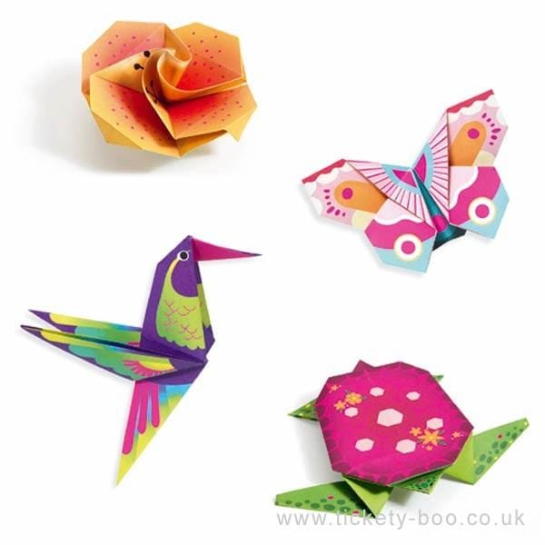 Jonge kinderen kunnen zich met dit knutselpakket de eerste beginselen van het Origami vouwen eigen maken. Met de stap voor stap instructie uit het meegeleverde boekje leren zij precies hoe ze de mooie Tropische dieren moeten vouwen. De drie verschillende dieren en bloem kan je in twee verschillende kleuren maken. In het pakket zitten 3x8 verschillende vouwblaadjes.
