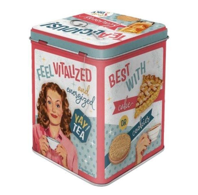 Dit vrolijke retro blik met de tekst "Tealicious and Tearrific" is de perfecte opbergplaats voor al je theezakjes. Het ontwerp is een knipoog naar de wereld van de thee en zal zeker een glimlach op je gezicht toveren.
