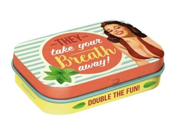 Een leuk Pepermunt doosje met de afbeelding 'Take your breath away' erop. Het is een klein doosje, dus past altijd in je tas of jaszak. Fijn wanneer je onderweg bent. In het doosje zitten suikervrije pepermuntjes die je later altijd kan vervangen voor iets anders wanneer het blikje is leeg gegeten. De Mint doosjes zijn natuurlijk ook een fantastisch cadeautje; voor iedereen een passende tekst.