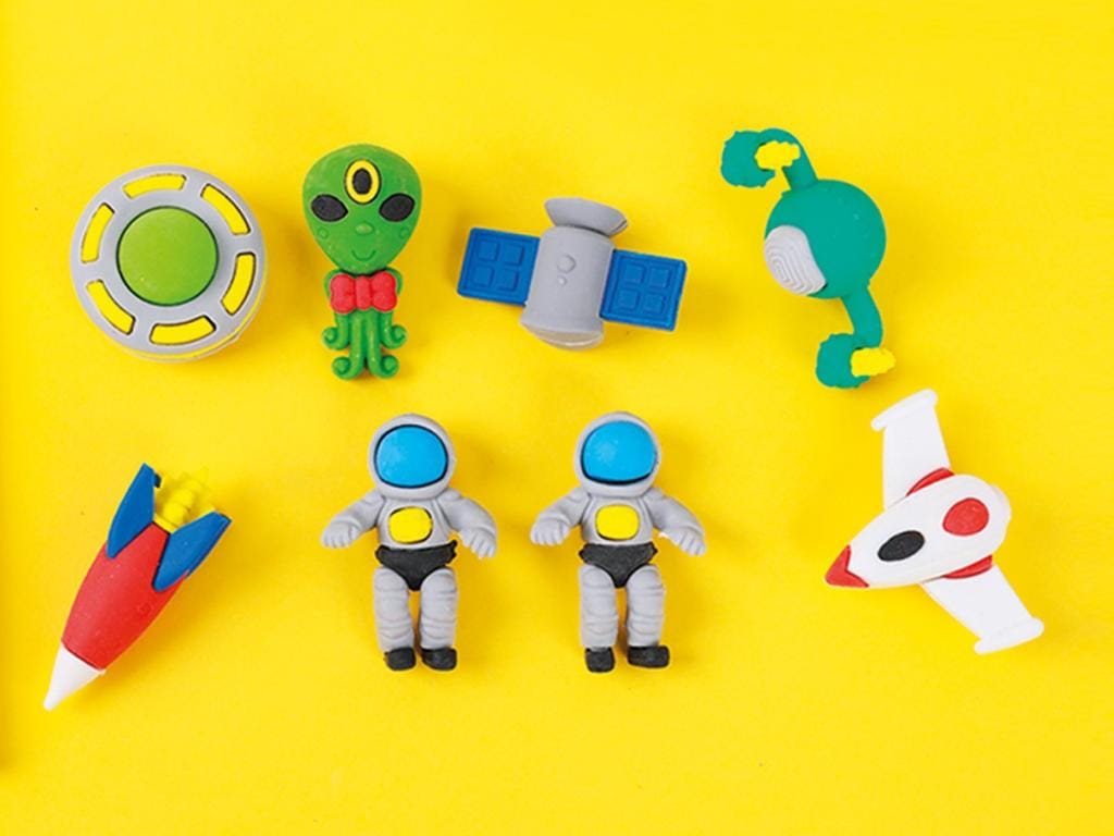 Leuke Space gummen per 2 verpakt. Wanneer je dan toch een foutje hebt gemaakt in het schrijven of tekenen, dan wil je het liefst je fouten wissen met een leuke gum. De space gummen worden assorti geleverd en wij leveren wat voorradig is.