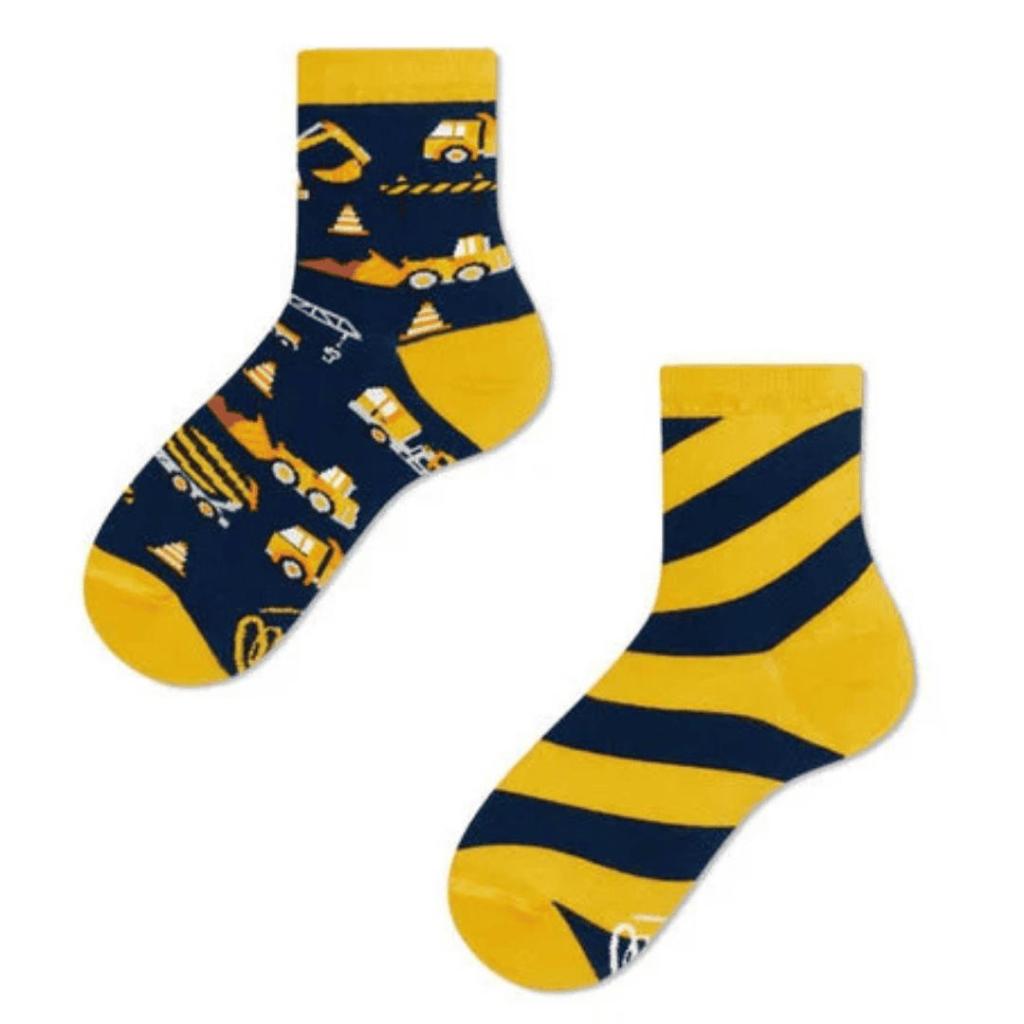 De Many Mornings The Builder kindersokken brengen plezier naar elke werkplek – of dat nu de zandbak is of de huiskamer. Eén sok staat vol met stoere bouwvoertuigen, de ander heeft opvallende geel-zwarte strepen, net als een echte bouwplaats. Gemaakt van zacht, ademend katoen en met een comfortabele pasvorm die goed blijft zitten, ook tijdens drukke speelsessies.