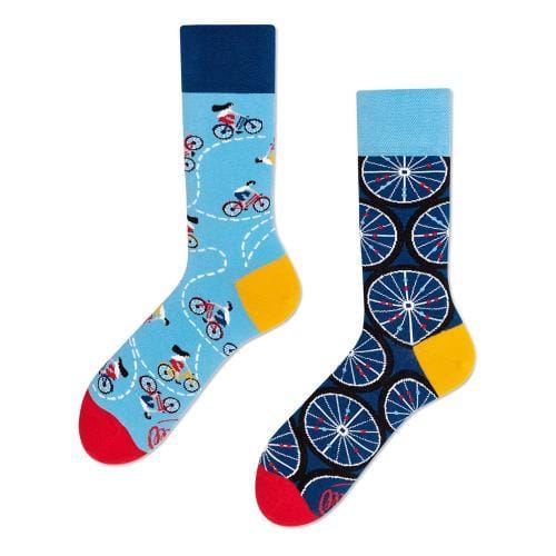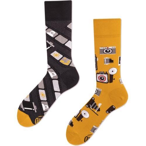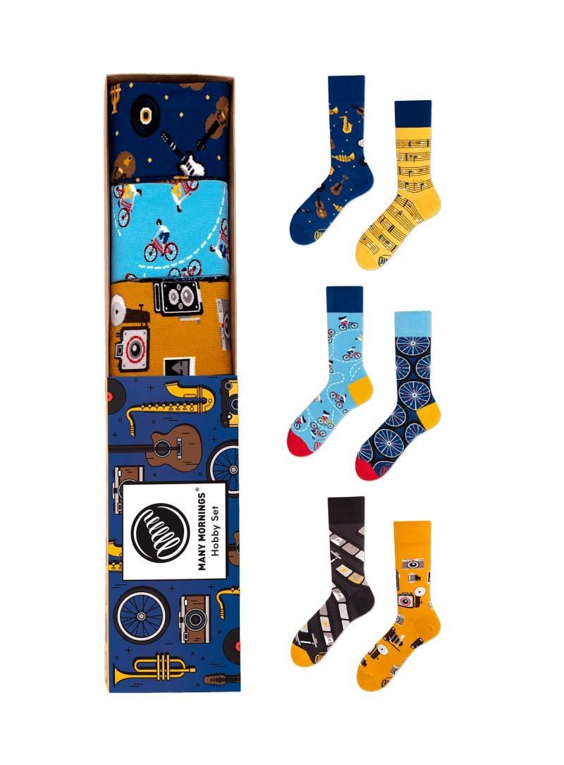 Drie paar vrolijke sokken van fijne hobby's waar bijna iedereen wel iets mee heeft: fotografie, fietsen en muziek. Of je ze nu zelf beoefend of er graag naar kijkt of luistert. Ieder paar sokken bestaat uit 2 verschillende sokken die samen het perfecte paar vormen. De grotendeels katoenen sokken zijn verkrijgbaar in 3 maten voor de schoenmaten 35 t/m 46.