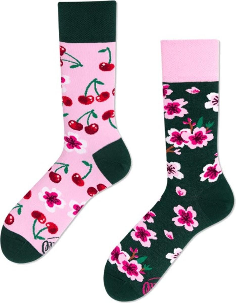 Met deze vrolijke sokken zie je op de ene sok de prachtige kersenbloesem zoals we die in de lente zien, en op de andere sok de vruchten die vervolgens in de nazomer aan de bomen groeien. Een superleuk paar MisMatch sokken van het Poolse Many Mornings. Alle katoenen sokken zijn verkrijgbaar in 3 maten voor de schoenmaten 35 t/m 46.
