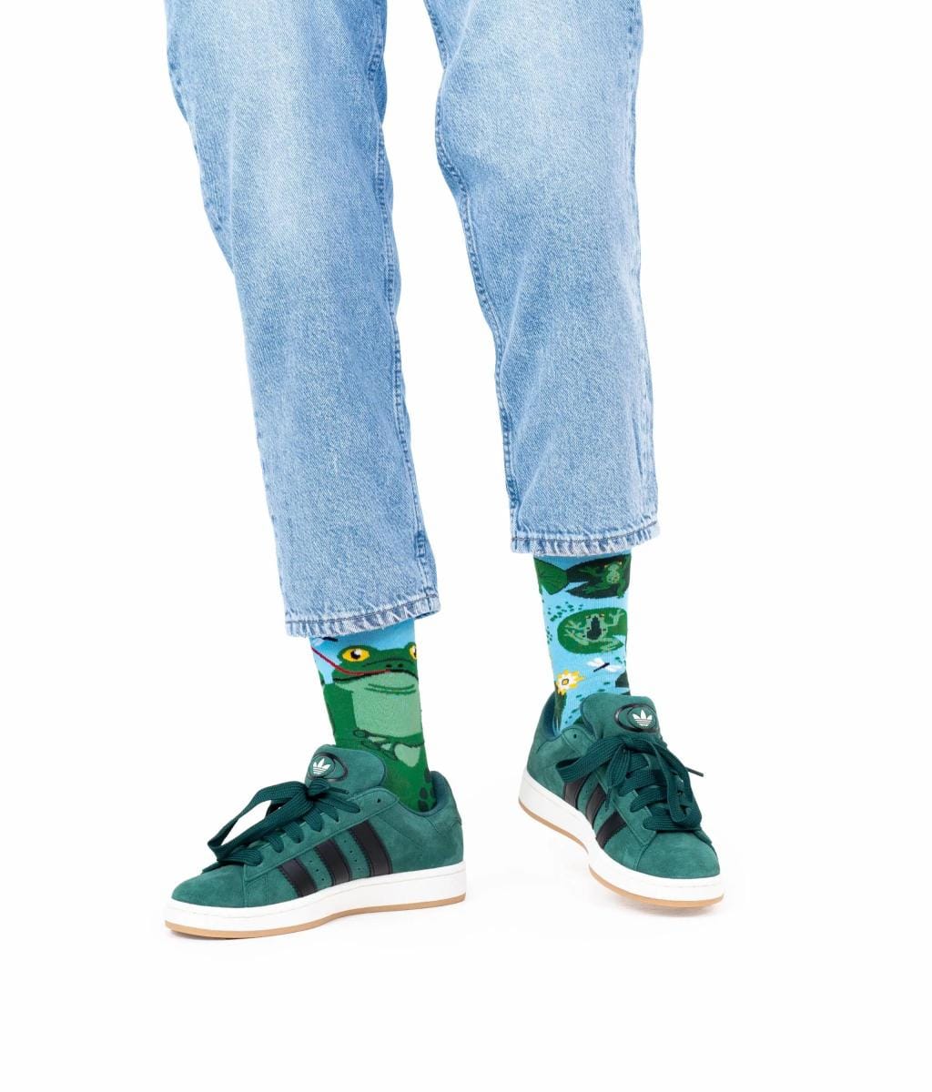 Spring vrolijk de dag in met deze kleurrijke kikkersokken van Many Mornings! In maat 35–38, met een levendig ontwerp van waterlelies, libellen en kikkers die hun beste sprong laten zien. Eén sok toont een kikker tussen waterplanten, de ander een grote kikker met een libel op z’n tong.