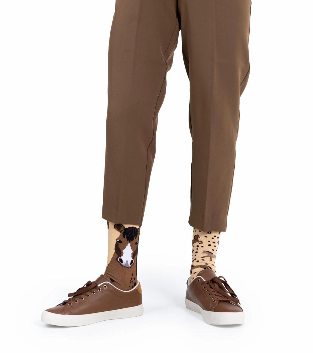 Laat je liefde voor paarden zien van top tot teen met deze Wild Horse sokken van Many Mornings in maat 39–42. Het mismatched ontwerp bestaat uit een sok met een indrukwekkend paardenhoofd en een sok vol galopperende viervoeters in verschillende tinten bruin. De sokken zijn gemaakt van een zachte katoenmix met veel stretch, zodat ze perfect zitten en de hele dag comfortabel blijven. Ideaal voor ruiters, paardenmeisjes of wie gewoon dol is op alles met een paard erop.