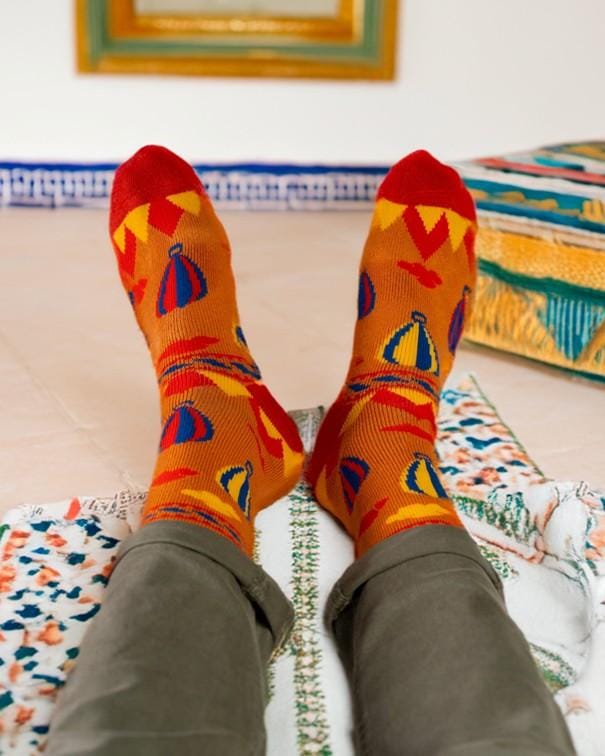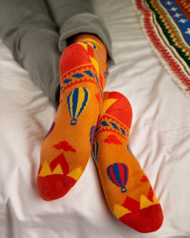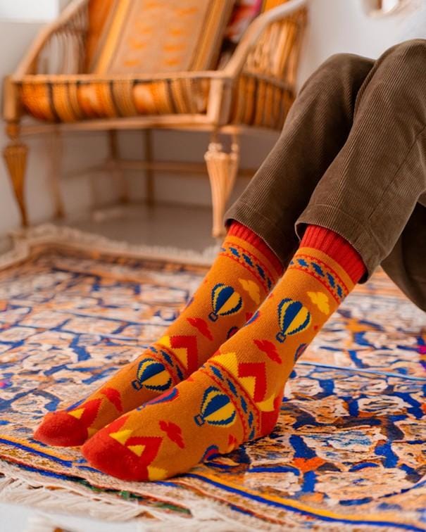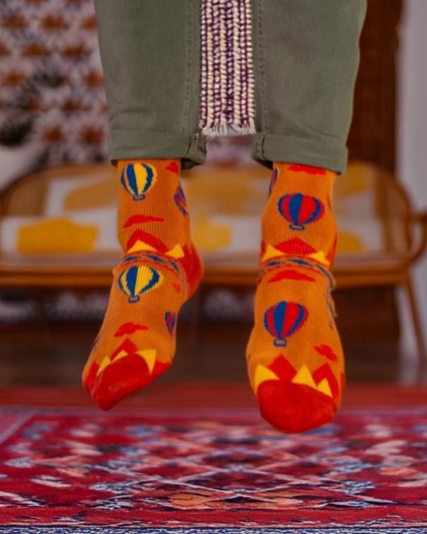 Een vleugje retro-chic voor je voeten. Onze oranjekleurige sokken met luchtballonprint zijn een stijlvolle keuze voor de moderne avonturier. Ontdek de wereld, één stap tegelijk