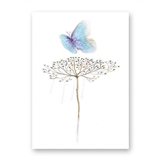 Een delicate illustratie van een blauwe vlinder op een bloeiende plant. Deze kaart symboliseert groei en verandering en is ideaal voor een inspirerende boodschap.