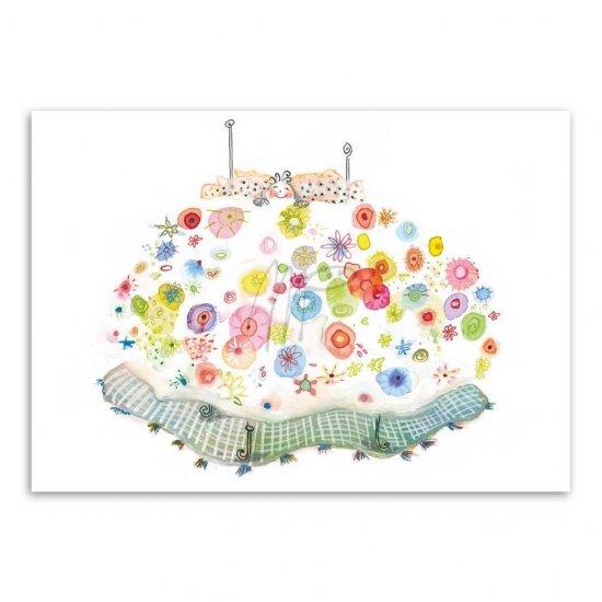 Deze kaart straalt rust en warmte uit. Een betoverende illustratie van een bed met een kleurrijke, bloemrijke deken die doet denken aan zoete dromen. Een perfect kaartje voor een liefdevolle boodschap of als wens voor een goede nachtrust.
