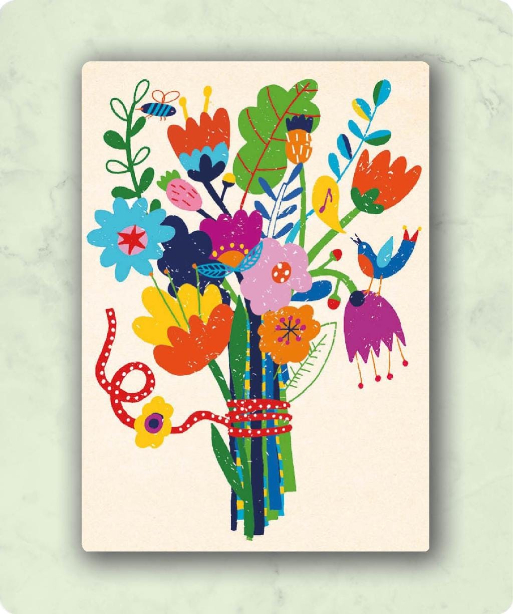 De "Boeket" postkaart van Zintenz is een kleurrijke en vrolijke kaart die het gevoel van bloei en schoonheid uitstraalt. Met een prachtig bloemenboeket als ontwerp, is deze kaart perfect voor elk moment waarop je iemand wilt feliciteren, bedanken of gewoon wat liefde en positiviteit wilt sturen. De levendige bloemen en de frisse uitstraling maken het een ideale keuze voor een verjaardag, een speciale gelegenheid of gewoon om iemand een glimlach te bezorgen. Gedrukt op 100% gerecycled papier met milieuvriendelijke inkt, is deze kaart een duurzame manier om een vrolijk bericht over te brengen.