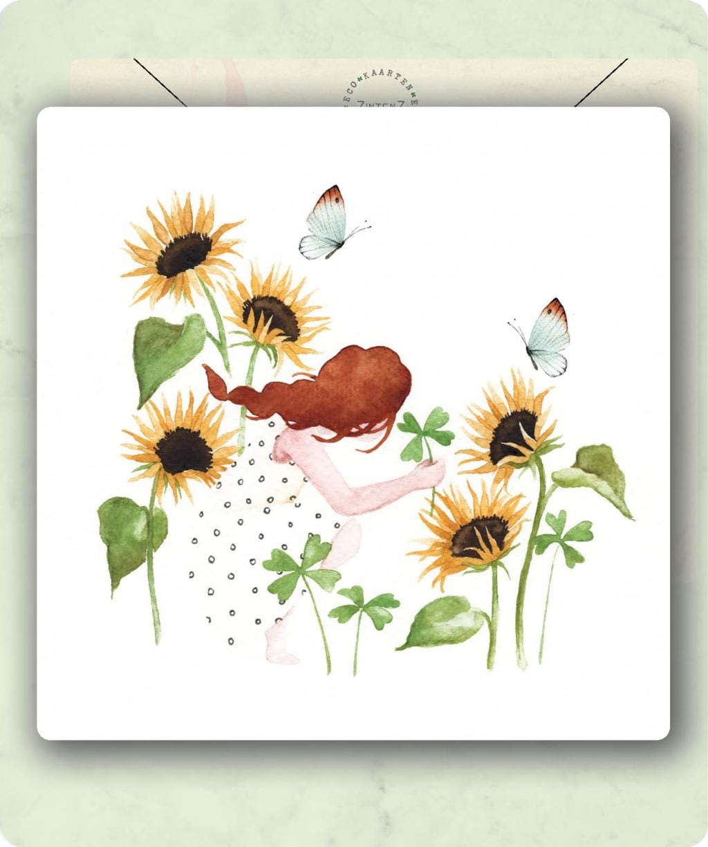 Deze sfeervolle postkaart van Zintenz toont een teder moment: een meisje dat bloemen plukt in een serene omgeving. Een prachtige kaart om te sturen naar iemand die van de natuur houdt of gewoon een warm gebaar verdient. Dankzij de duurzame productie op 100% gerecycled papier en de bedrukking met milieuvriendelijke vegetale inkten, is deze kaart niet alleen een betekenisvolle, maar ook een bewuste keuze. Geschikt voor elke gelegenheid waarbij je iemand een stukje rust en schoonheid wilt sturen.