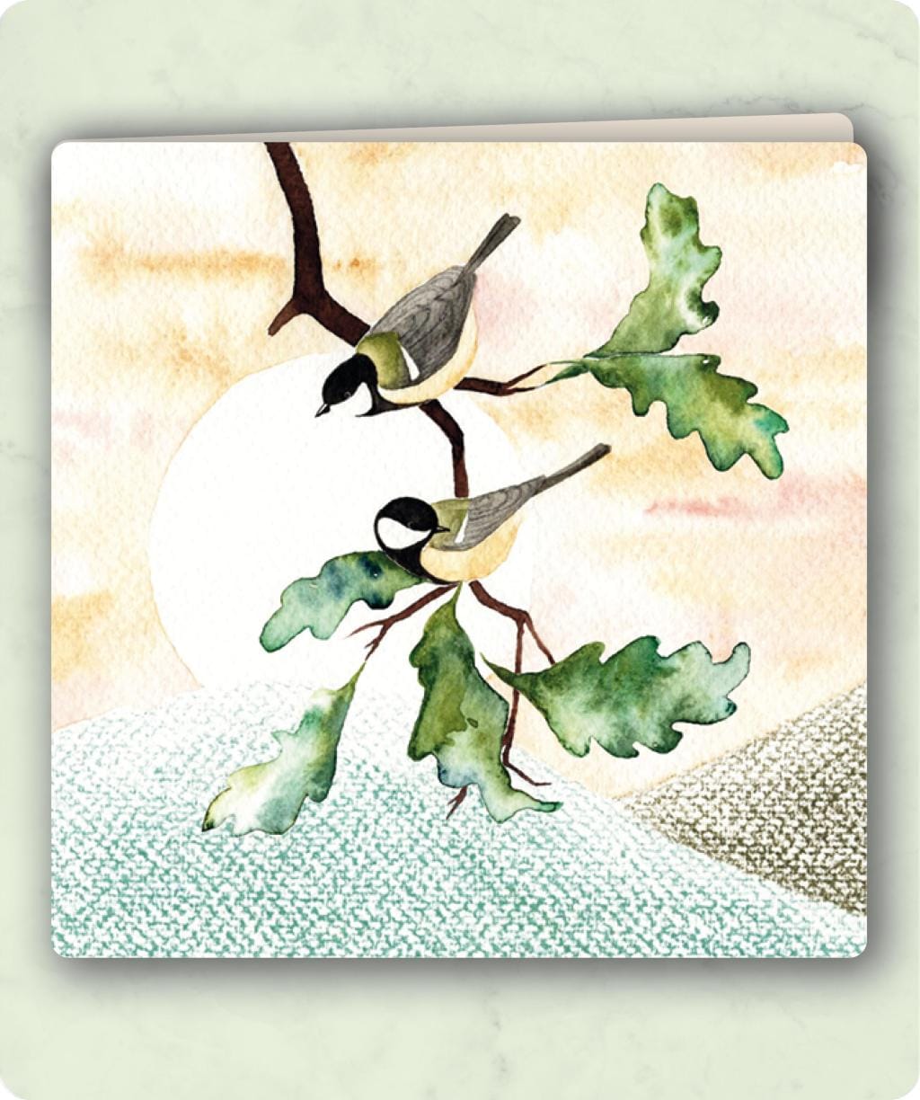 Een sfeervolle en rustgevende Zintenz dubbele kaart met een illustratie van vrolijke vogeltjes in een boom. Deze kaart straalt harmonie en verbondenheid uit, perfect om iemand een warm bericht te sturen, te feliciteren of gewoon als klein gebaar van aandacht.