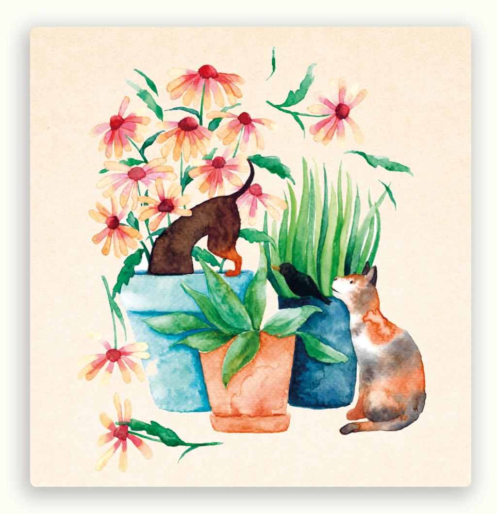 Een vrolijke huiselijke scène vol dierenliefde en groen! Op deze vierkante kaart van ZintenZ zie je een nieuwsgierige teckel die met zijn kop tussen de bloemen duikt, een kat die gefascineerd naar een merel kijkt en een verzameling bloeiende en groene kamerplanten in kleurige potten. Perfect voor plantenliefhebbers, kattenmensen en iedereen met een zwak voor gezelligheid.