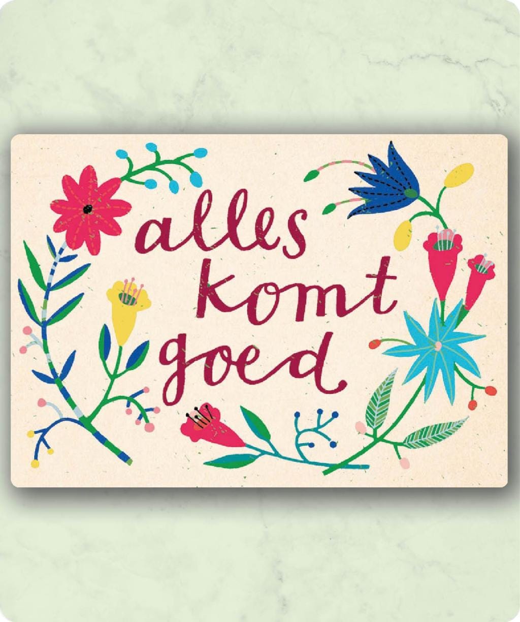 De "Alles Komt Goed" postkaart van Zintenz is een geruststellende en positieve kaart die hoop en vertrouwen uitstraalt. De tekst "Alles komt goed" is een reminder dat, ongeacht de uitdagingen die we tegenkomen, er altijd licht aan het eind van de tunnel is. Het is de perfecte kaart om iemand op te beuren, een hart onder de riem te steken of als bemoediging in moeilijke tijden. Gedrukt op 100% gerecycled papier met milieuvriendelijke inkt, biedt deze kaart zowel een positieve boodschap als een duurzame keuze.