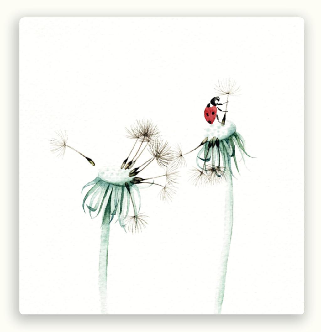 Een poëtisch moment gevangen in aquarel: op deze minimalistische kaart van ZintenZ zit een rood lieveheersbeestje op een uitgebloeide paardenbloem. De zaadpluisjes dwarrelen weg in de wind – een verstild beeld vol zachtheid en detail.