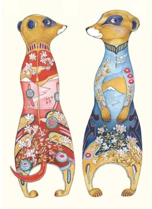 Nieuwsgierig en altijd alert – deze stokstaartjes hebben stijl! Met hun kleurrijke patronen en subtiele landschappen op hun vacht vertellen ze elk een eigen verhaal. Een speelse en kunstzinnige kaart, perfect voor een vrolijke groet of om gewoon zelf van te genieten.
