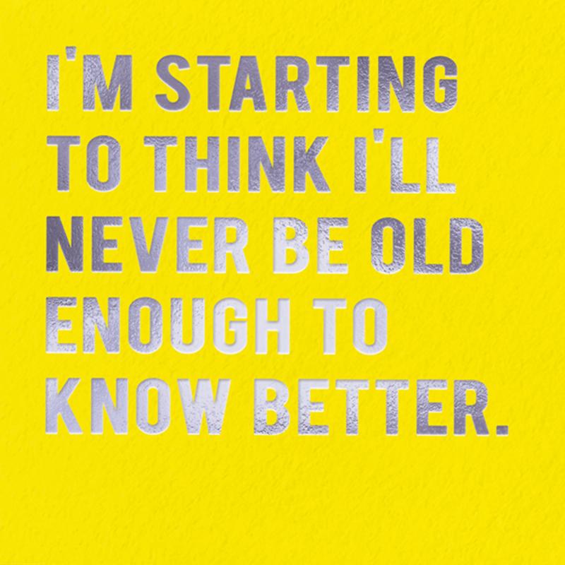 - 💬 Tekst voorkant: I’M STARTING TO THINK I’LL NEVER BE OLD ENOUGH TO KNOW BETTER.