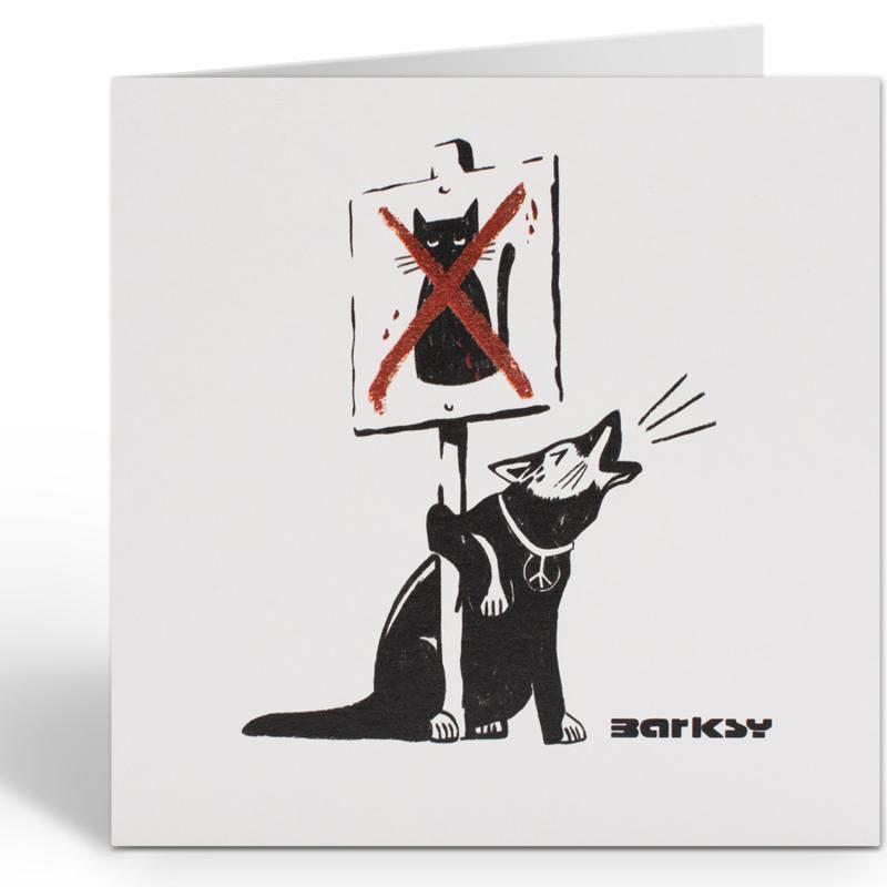 De Niaski Barksy kaart is een knipoog naar de wereldberoemde streetart van Banksy – maar dan met een hond in de hoofdrol. De illustratie toont een blaffende hond met een vredesteken om zijn nek en een protestbord met een doorgehaalde kat. Een grappige en eigenzinnige kaart voor kunstliefhebbers, hondenfans of iedereen die houdt van een beetje satire.