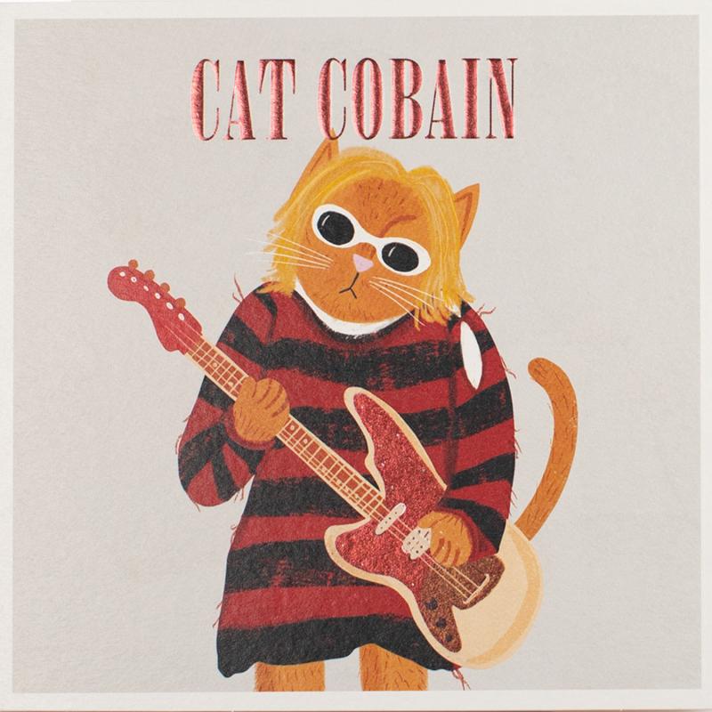 De Niaski Cat Cobain kaart is een creatieve ode aan rocklegende Kurt Cobain — maar dan in kattenvorm. Met zijn gestreepte trui, blonde haren en gitaar is deze muzikale kat direct herkenbaar. Een perfecte kaart voor muziekliefhebbers, Nirvana-fans of iedereen die houdt van humor met een vleugje nostalgie.