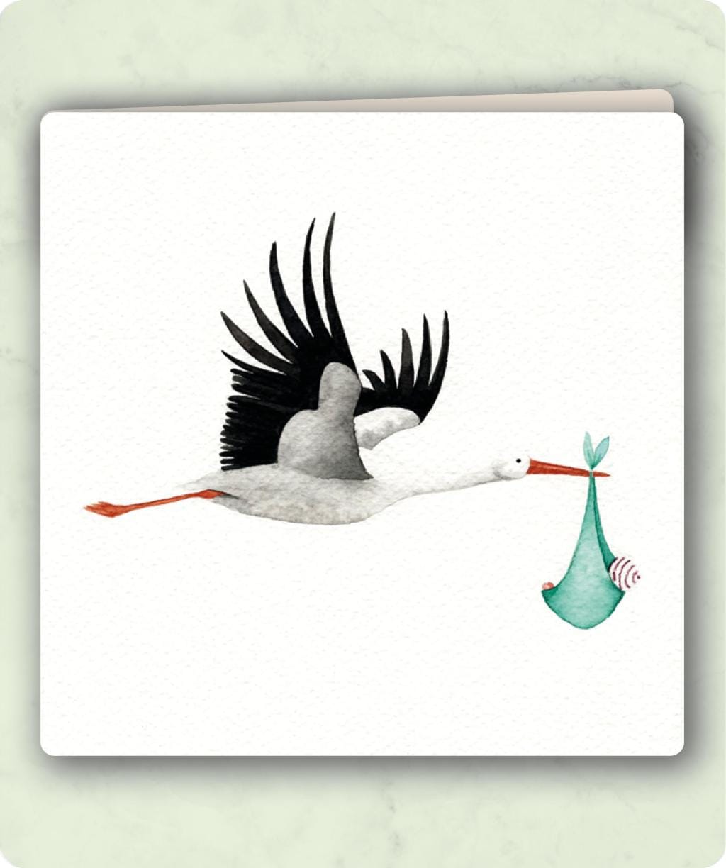 Een sfeervolle en symbolische Zintenz dubbele kaart met een illustratie van een ooievaar die op bezoek komt. De ooievaar staat al eeuwenlang symbool voor nieuw leven en geboorte, waardoor deze kaart perfect is om kersverse ouders te feliciteren of om een zwangerschap aan te kondigen. Deze kaart is gedrukt op 100% gerecycled papier en bedrukt met vegetale, milieuvriendelijke inkten, wat zorgt voor een duurzame en bewuste keuze. De binnenkant is blanco, zodat er alle ruimte is voor een persoonlijke boodschap.