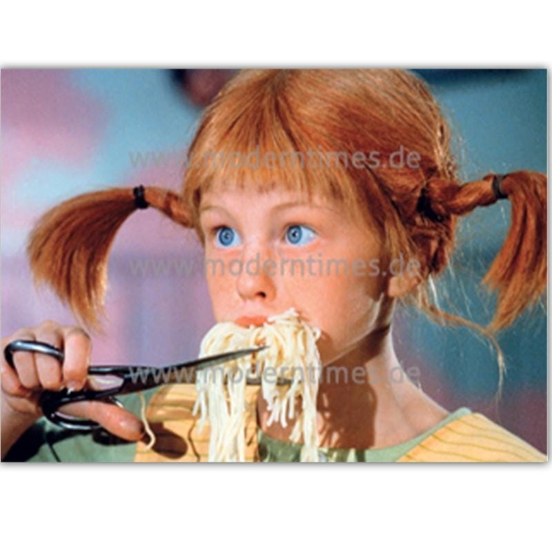 Spaghetti eten met een schaar? Alleen Pippi Langkous komt daarmee weg! Deze hilarische fotokaart toont haar zoals we haar kennen: creatief, eigenwijs en totaal niet onder de indruk van conventies. Een vrolijke kaart die perfect is om op te sturen met een knipoog – of gewoon om jezelf te laten glimlachen.