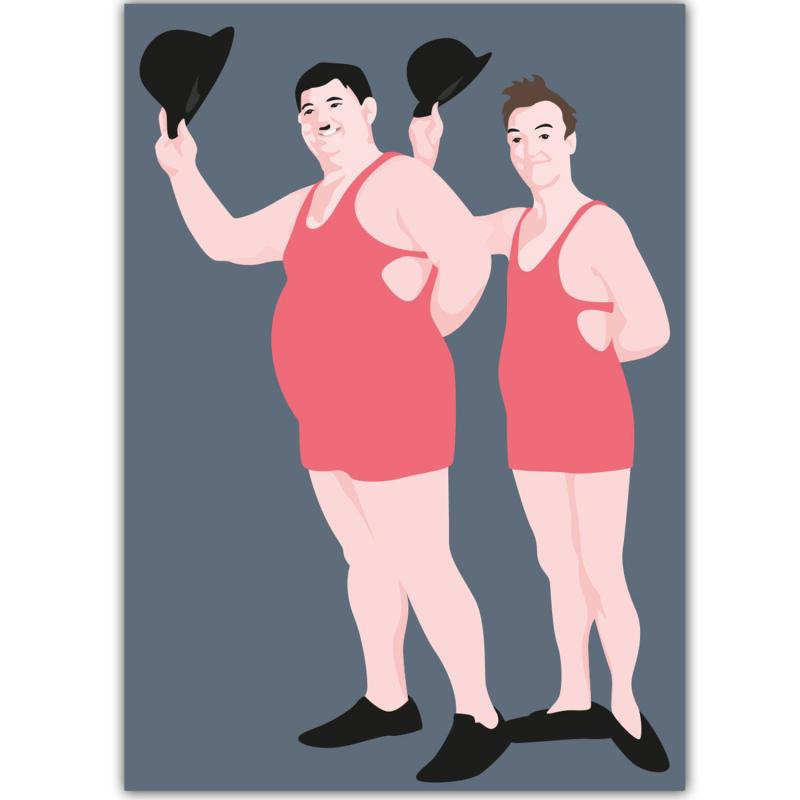 Laurel en Hardy, oftewel De Dikke en de Dunne, zijn op deze ansichtkaart vereeuwigd in charmante pop-art stijl. Gehuld in retro badpakken en met bolhoed in de hand, brengen ze een glimlach op je gezicht – precies zoals ze dat vroeger op het witte doek deden. De kaart is gedrukt op stevig A6-formaat, op 350 grams natuurlijk papier met een matte afwerking. Een humoristische en nostalgische kaart voor filmliefhebbers, verzamelaars of gewoon voor jezelf.