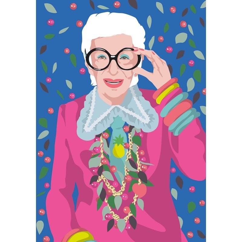 Laat je inspireren door de onnavolgbare stijl van mode-icoon Iris Apfel met onze prachtige ansichtkaart! Deze kaart is een eerbetoon aan de unieke flair, levendige kleuren en gedurfde accessoires die Iris Apfel tot een ware legende in de modewereld maken.