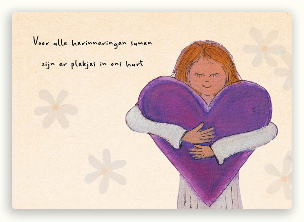 Een zachte, troostrijke kaart met een meisje dat een groot paars hart omarmt. Deze ZintenZ kaart is perfect om iemand sterkte te wensen, een warme herinnering te delen of gewoon te laten weten: ik denk aan je.