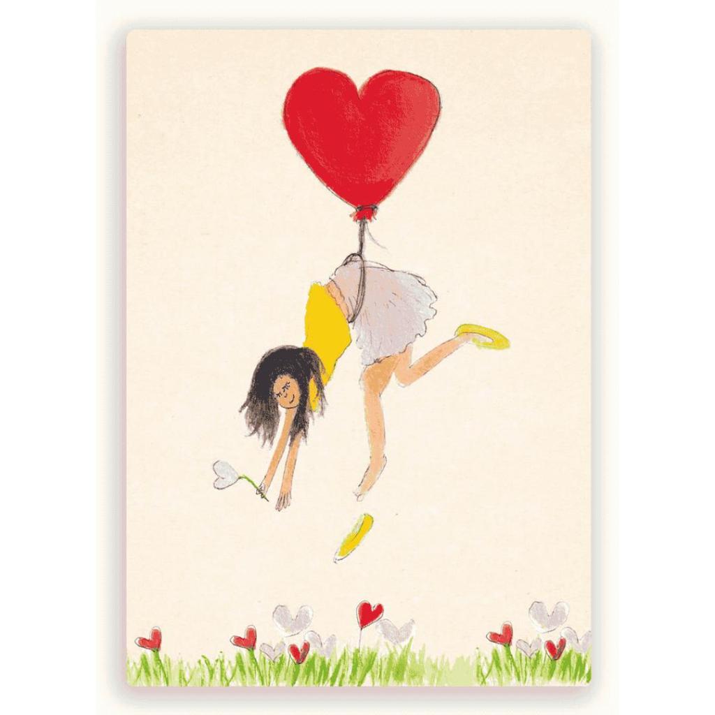 Laat je hart spreken met deze dromerige postkaart vol liefde. Een meisje zweeft sierlijk door de lucht aan een grote rode ballon in hartvorm, terwijl ze onderweg een wit bloemetje uit de wei plukt. De speelse illustratie straalt romantiek, vrijheid en zachtheid uit – perfect om iemand te laten weten dat je aan ze denkt, of om gewoon wat extra liefde te sturen.