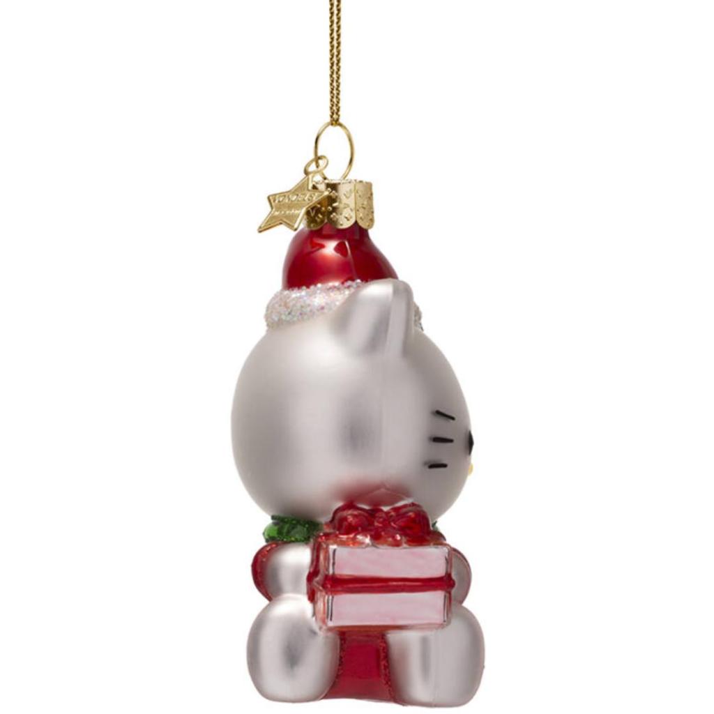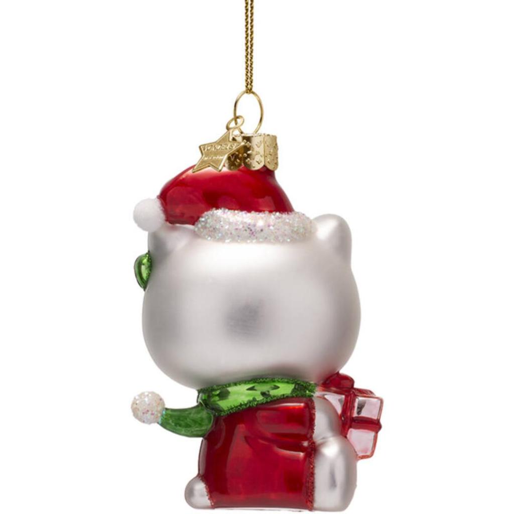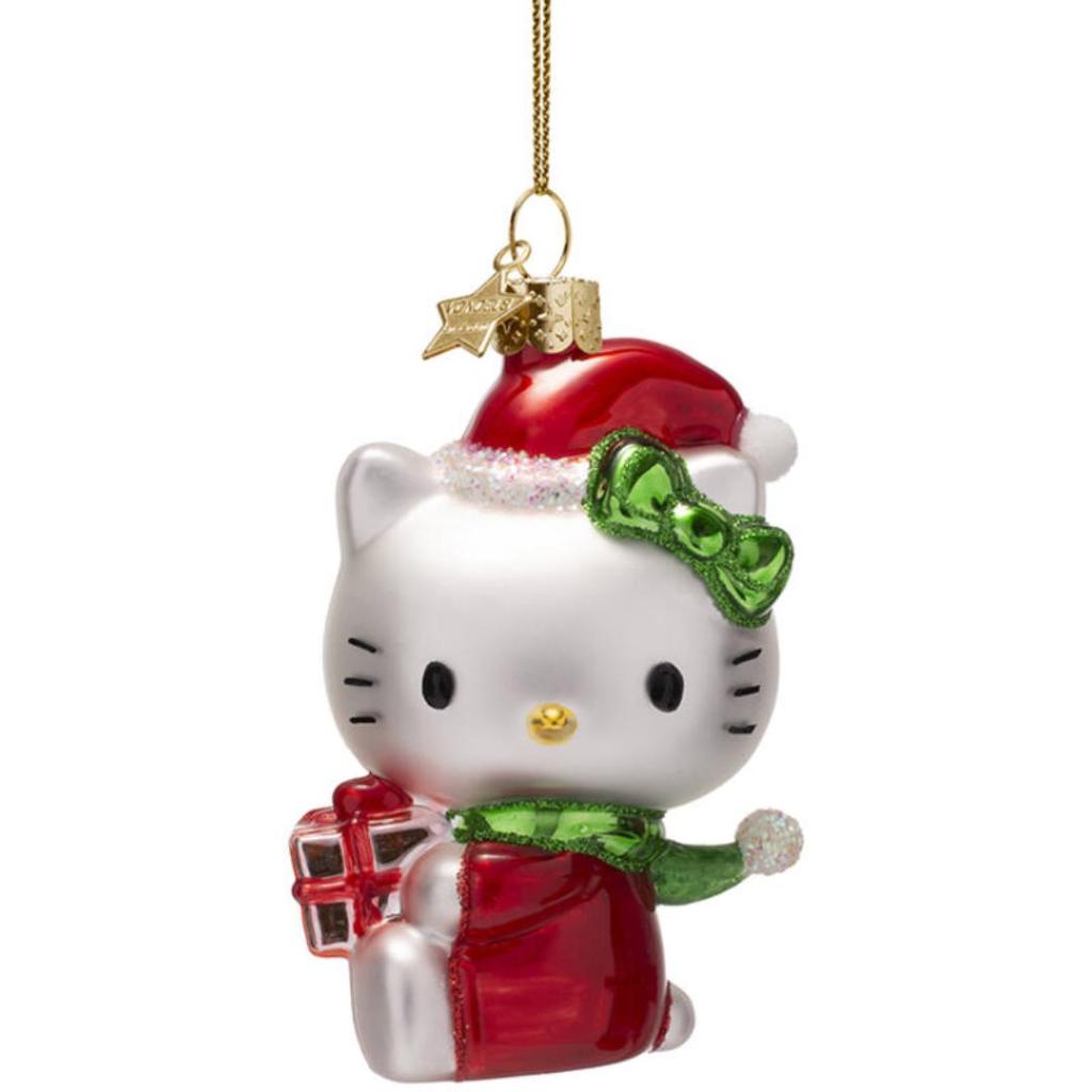 Breng extra vrolijkheid in je kerstboom met deze glazen Hello Kitty-kerstbal van Vondels. Het ornament toont Hello Kitty in een rode kerstoutfit met kerstmuts, groene glitterstrik en een glanzend cadeautje in haar pootjes. De kerstbal is 9 cm hoog en met de hand beschilderd. Een must-have voor Hello Kitty-fans of als opvallende blikvanger tussen je ornamenten.