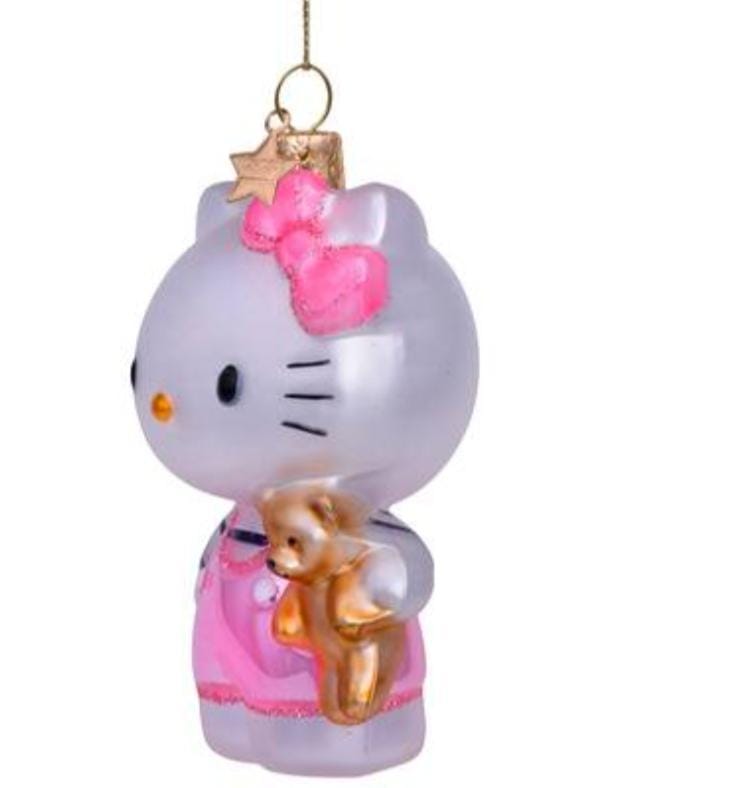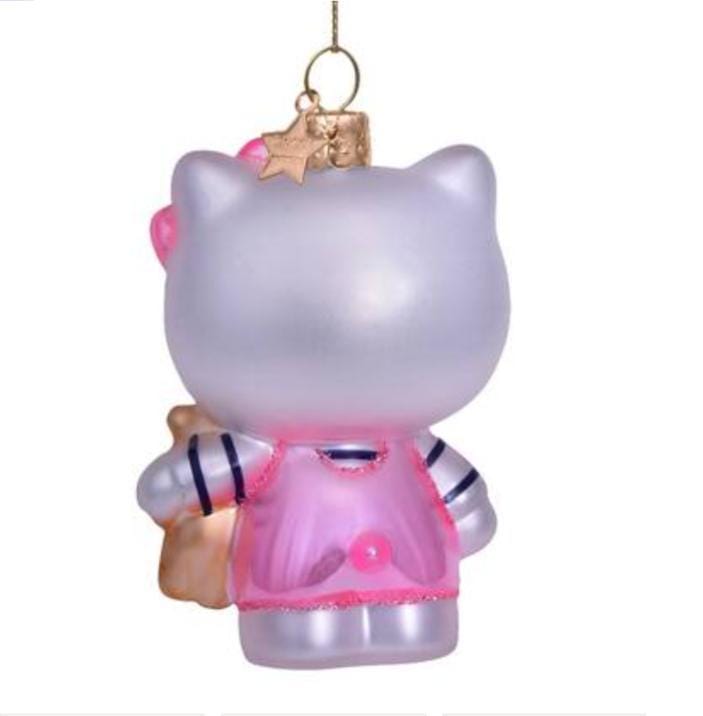 De Kerstbal Hello Kitty Roze met Beer is gemaakt van hoogwaardig glas en is met de grootste zorg mondgeblazen en handbeschilderd. Het ornament is 5 x 9 x 4 cm en is voorzien van een zilveren ophanghaakje.