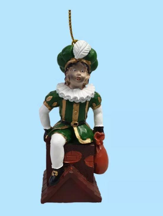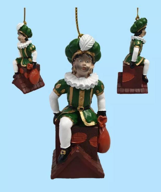 Kerstbal Polystone Roetveeg Piet op schoorsteen.