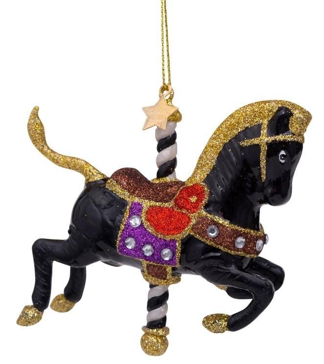 Dit prachtige zwarte paard beweegt sierlijk op de Draaimolen. Met deze originele glazen Kerstbal van Vondels waan je je meteen op deze leuke attractie. Het paard heeft mooie gouden details die zullen schitteren in de kerstboom. Combineer het paard met deze Zebra en tover je boom om tot draaimolen.