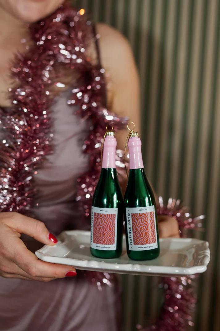 Proost! Deze glazen kerstbal in de vorm van een fles natuurwijn is het perfecte ornament voor wie houdt van een goed glas én een vleugje humor in de kerstboom. De glanzend groene fles met roze dop en retro etiket brengt instant feeststemming.