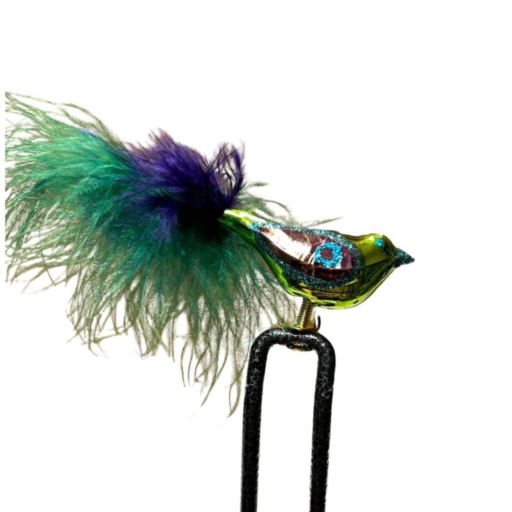 Breng een vleugje exotische flair naar je kerstboom met onze mini-vogel Jesse. Zijn levendige groene verenkleed en opvallende paarse staartveren creëren een betoverend schouwspel. Met zijn glinsterende oogjes en elegante houding is hij een echte eyecatcher. Deze handgemaakte glazen vogel is een unieke toevoeging aan elke kerstdecoratie.