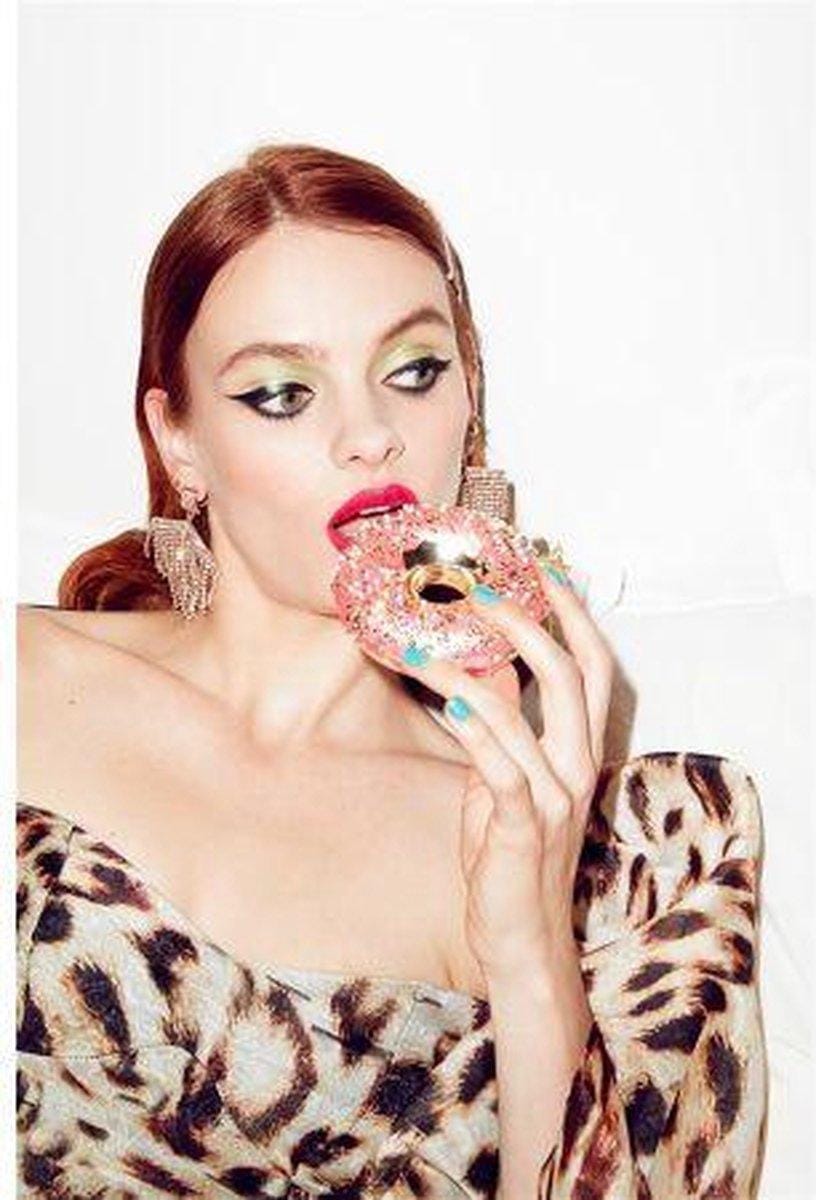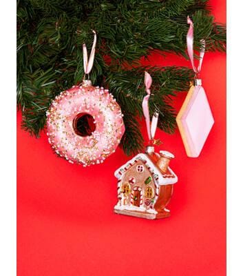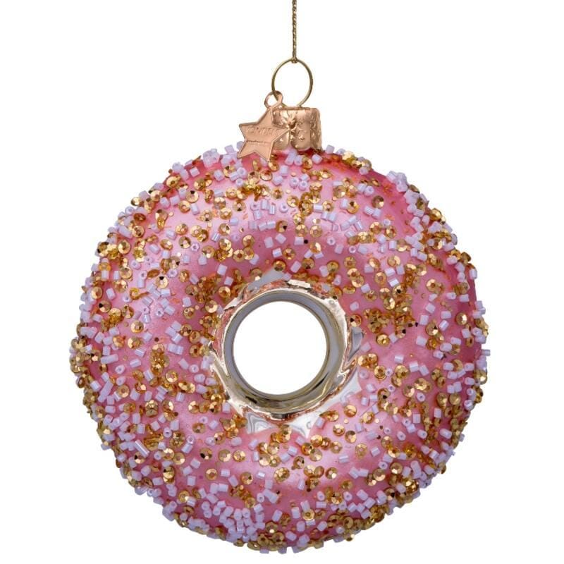 Hoewel deze donut oranje wordt genoemd is deze in werkelijkheid licht roze met goud en witte decoratie in de vorm van kraaltjes en pailletjes. De achterkant van deze donut is glanzend goud. Een kerstbal dat dus perfect past in de trends van kerst 2020 waarbij de kleuren roze en goud overheersen. De kerstbal van Vondels heeft een doorsnede van 11 cm.