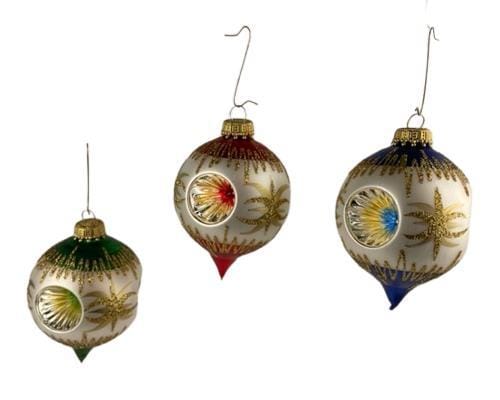 Deze set van drie heeft een rode, een groene en een blauwe bal met witte gouden decoraties. Ze zijn mondgeblazen en met de hand gedecoreerd met zig-zag patroon & gouden ster. Rondom iedere kerstbal zitten 3 deuken verdeeld over de bal. Leuk om te combineren met andere gouden kerstballen en ornamenten.