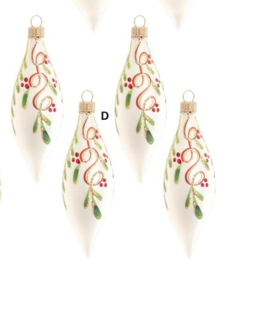 Deze set van vier langwerpige kerstballen heeft een slanke, elegante vorm die direct opvalt in de kerstboom. De glazen ornamenten zijn afgewerkt met een parelmoer glans en met de hand beschilderd met groene bladeren, rode besjes en verfijnde goudaccenten.