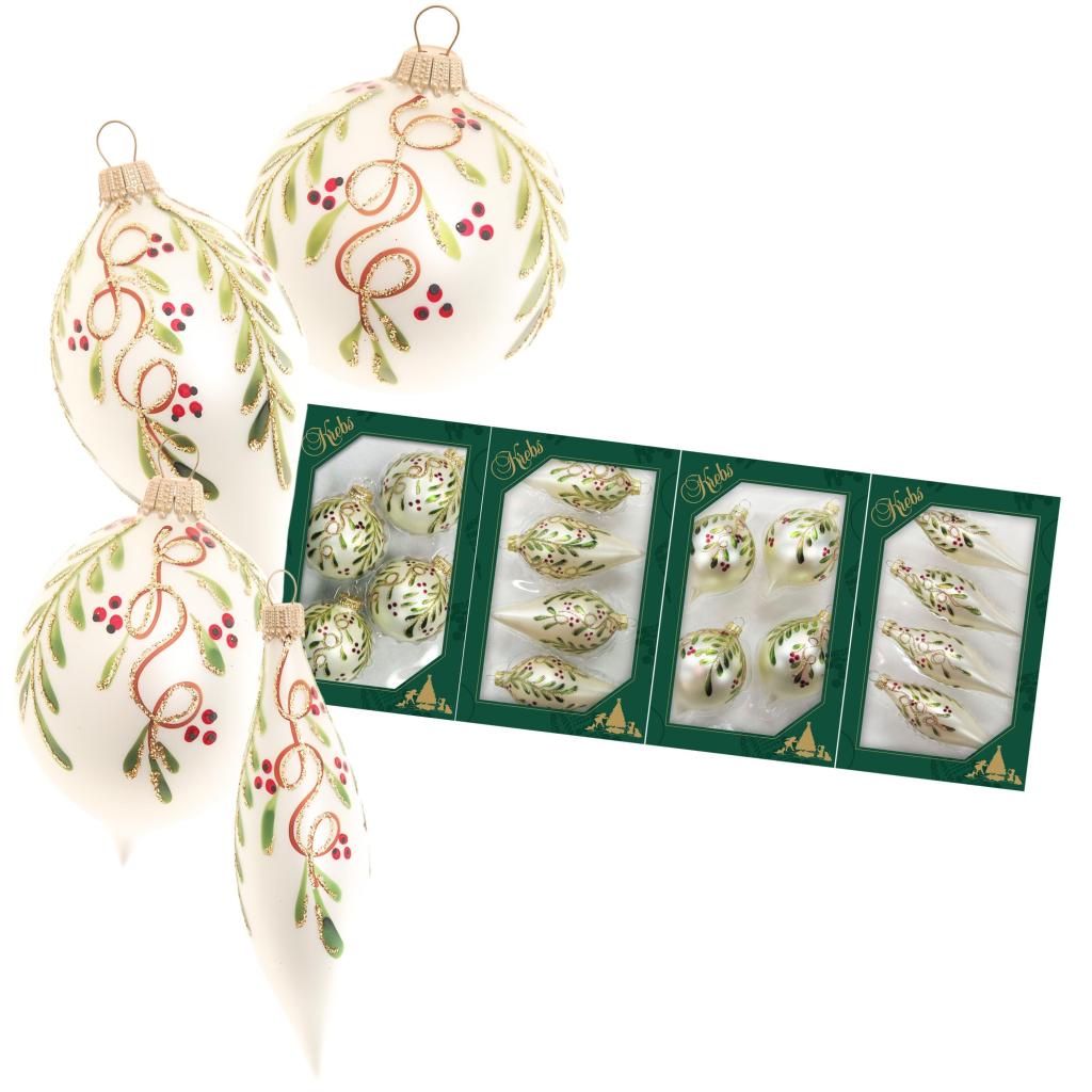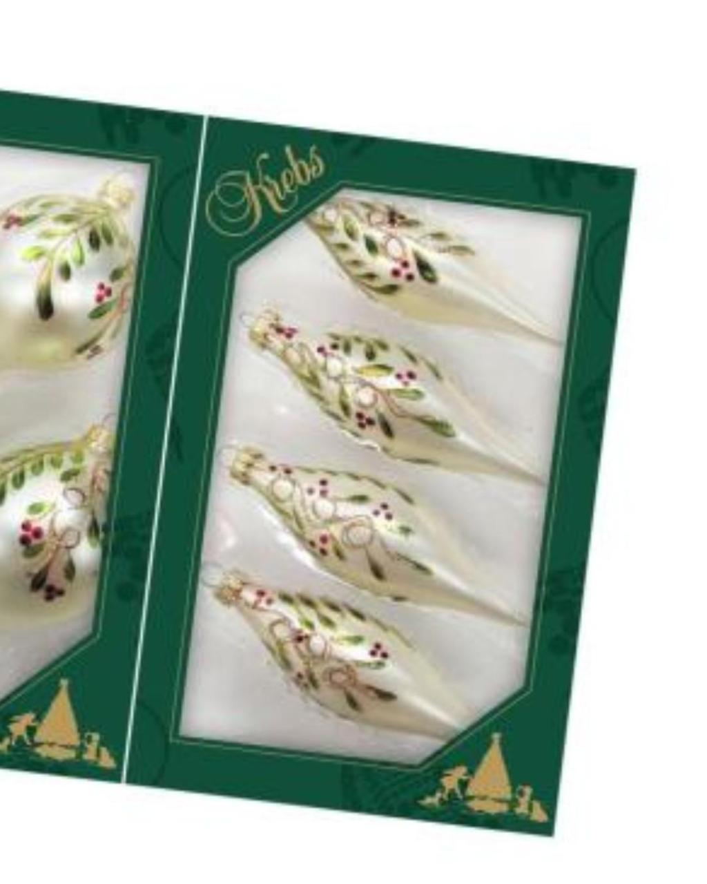 Set van 4 Kerstballen Parelmoer met Handbeschilderde Bladeren – Langwerpig | Krebs Glas Lauscha